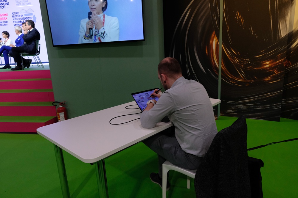 This mindset inspired the collaboration with Yoonik, which brought Jacopo Sacquegno to Made in Steel. During the conference, the artist performed a live graphic recording, creating a digital illustrated board that translated the content of the discussion into an immediate and engaging visual language.